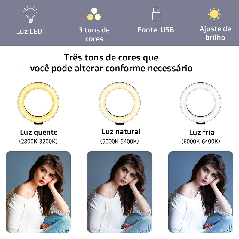 Carregamento Plug USB: a alimentação da luz de anel pode ser conectada ao computador ou alimentação portátil.