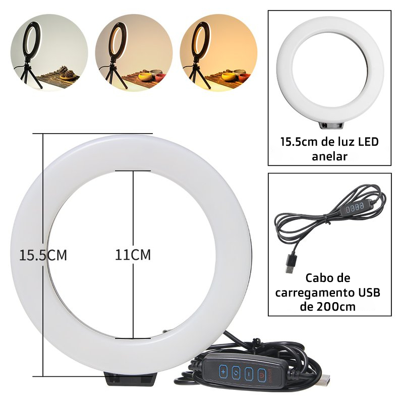 Anel de luz Youtuber de 16 cm com tripé e carga USB.