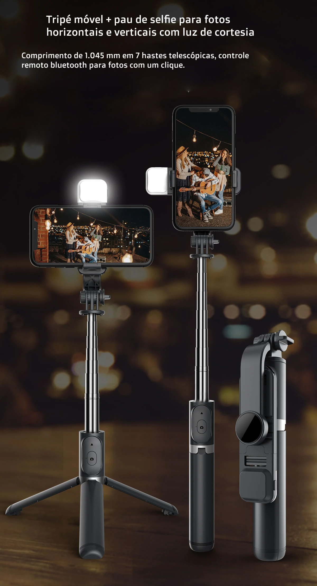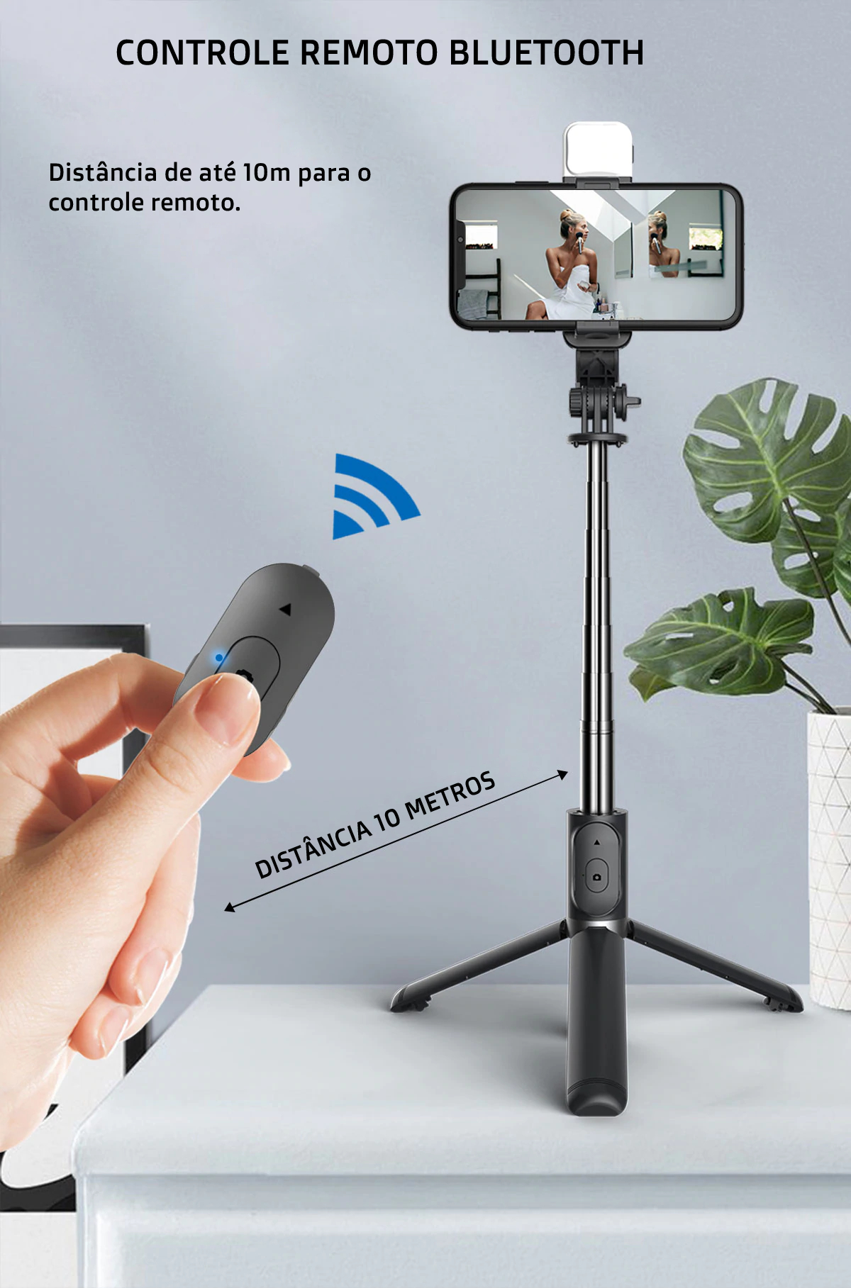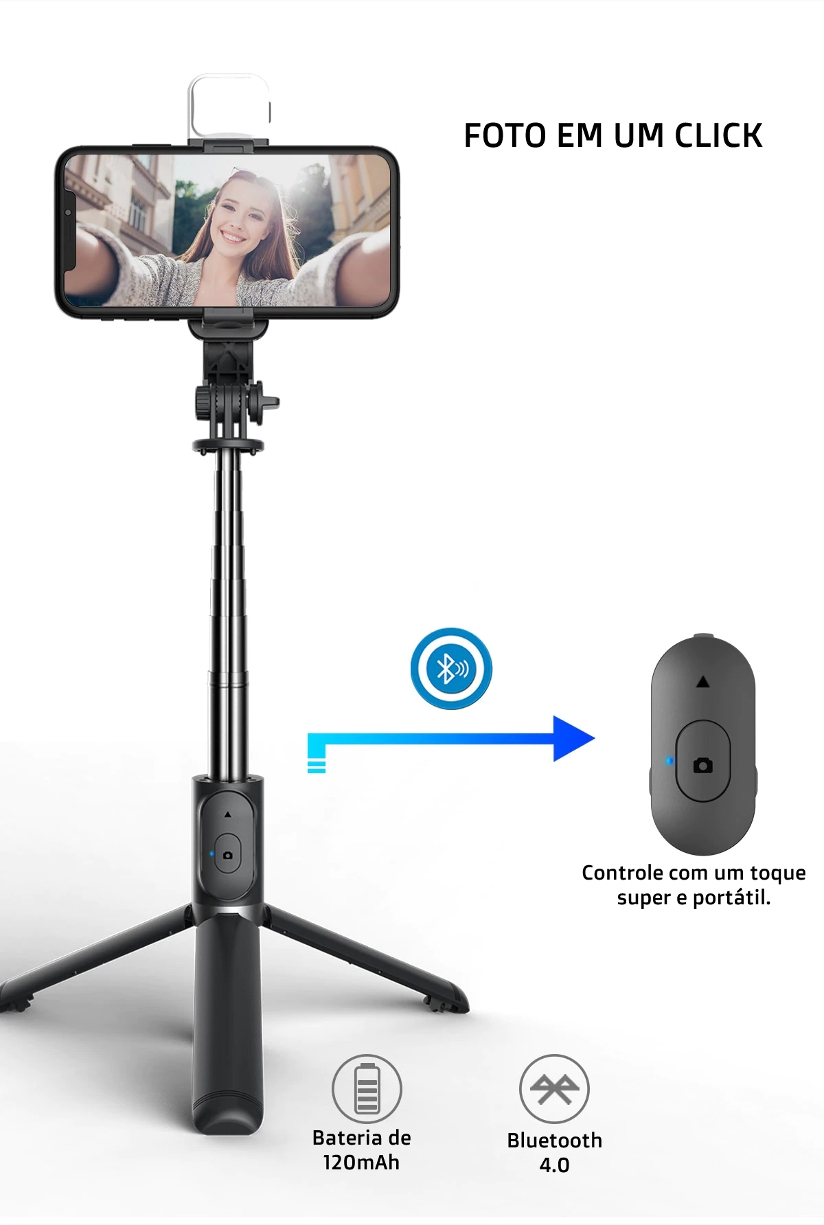 Bastão de selfie sem fio, mini tripé dobrável com controle remoto modelos COM e SEM LUZ cortesia e bluetooth, compatível com IOS e ANDROID carregamento USB.