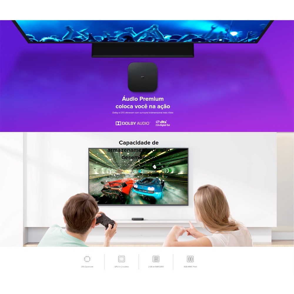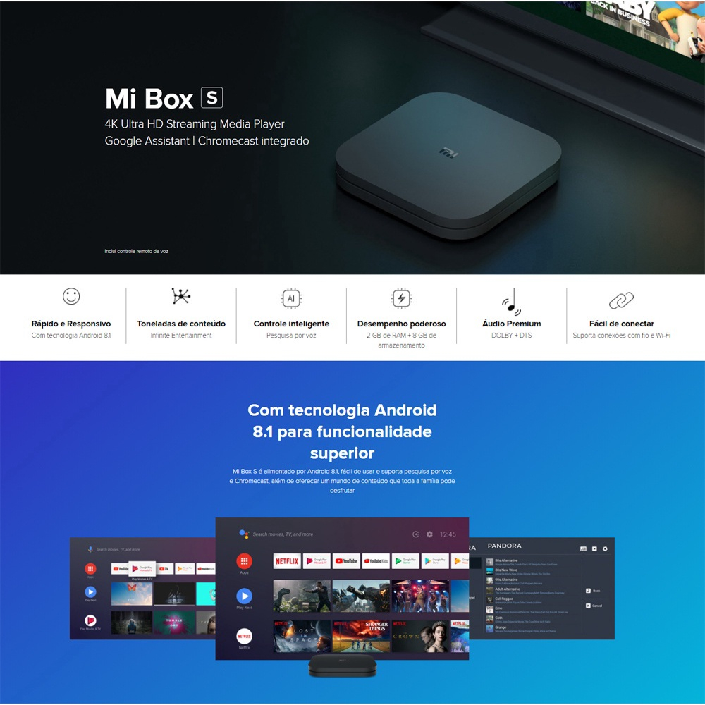 Mi Box S é movido por Android 8.1, fácil de usar e suporta pesquisa por voz e Chromecast, além de oferecer um mundo de conteúdo que toda a família pode desfrutar.